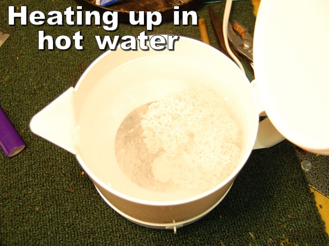 Jett Sett is a heat-malleable ceramic plastic. So, what does that mean? Basically I can heat up Jett Sett in hot water, form it into whatever shape I wish, then after use, it can be re-heated and used again and again. At room temperature, Jett Sett is hard as a rock, but heated up in hot water, Jett Sett has the consistency of modeling clay.