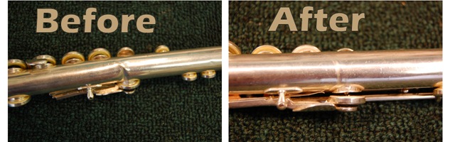 You can still see where the “dents” were, when the metal stretches the silver-plate micro-fractures, leaving the “cloudy” appearance. The plating can be stripped and the instrument re-plated, but most customers don’t opt for that.