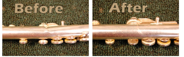This is what is commonly referred to as a Banana Flute in the repair industry. Basically a flute that has been sat on and bent, making it look like a banana. Below are some before and after pictures from a recent flute brought in for repair. This particular Gemeinhardt was bent between the Thumb Bb key and the B Key.
