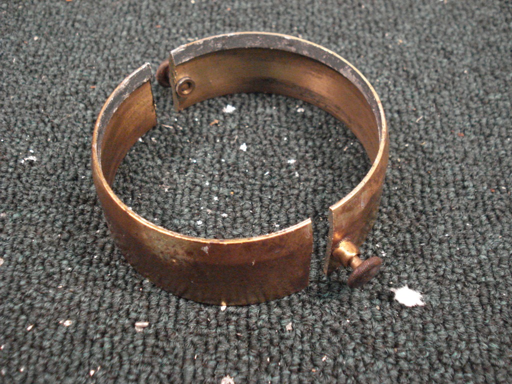 I had a bari sax come in with a missing brace. The part wasn’t readily available, so it was easier to fabricate one. I needed a think piece of brass, so a baritone bell ring from the “boneyard” became my starting point. After removing the bell ring, I’ve cut it in 1/2.