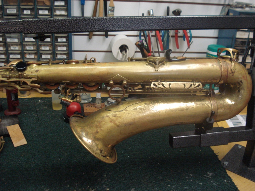 Everett Spells, local sax player & teacher brought his Selmer Mark VII Tenor in for a neck cork replacement and some tweaking. It had lots of rattles and clanks(as most horns develop over time). Some felt, some cork, some oil, and some heat shrink and it’s much much quieter now. I also had to adjust a few keys/pads, but nothing major. Don’t let appearances deceive you, this horn really blows! (<<<in the good kind of way!)