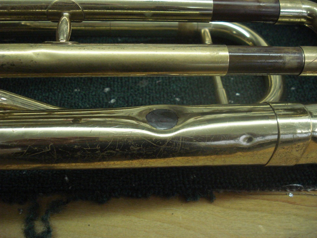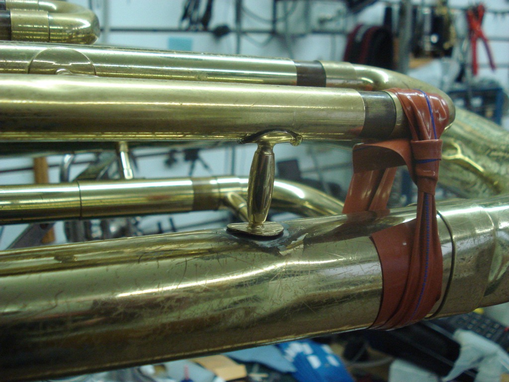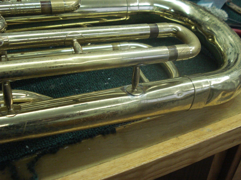 Left Pic – Damage to the upper branch on a Yamaha Euphonium. The brace dented the tubing when the damage occurred. There’s no easy access to this area, without unsoldering major parts of the horn, and the brace can’t be re-soldered with the dent in there.