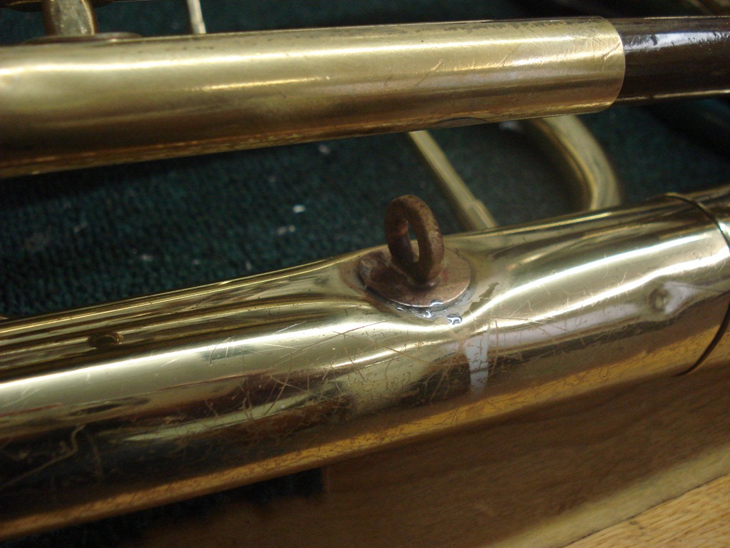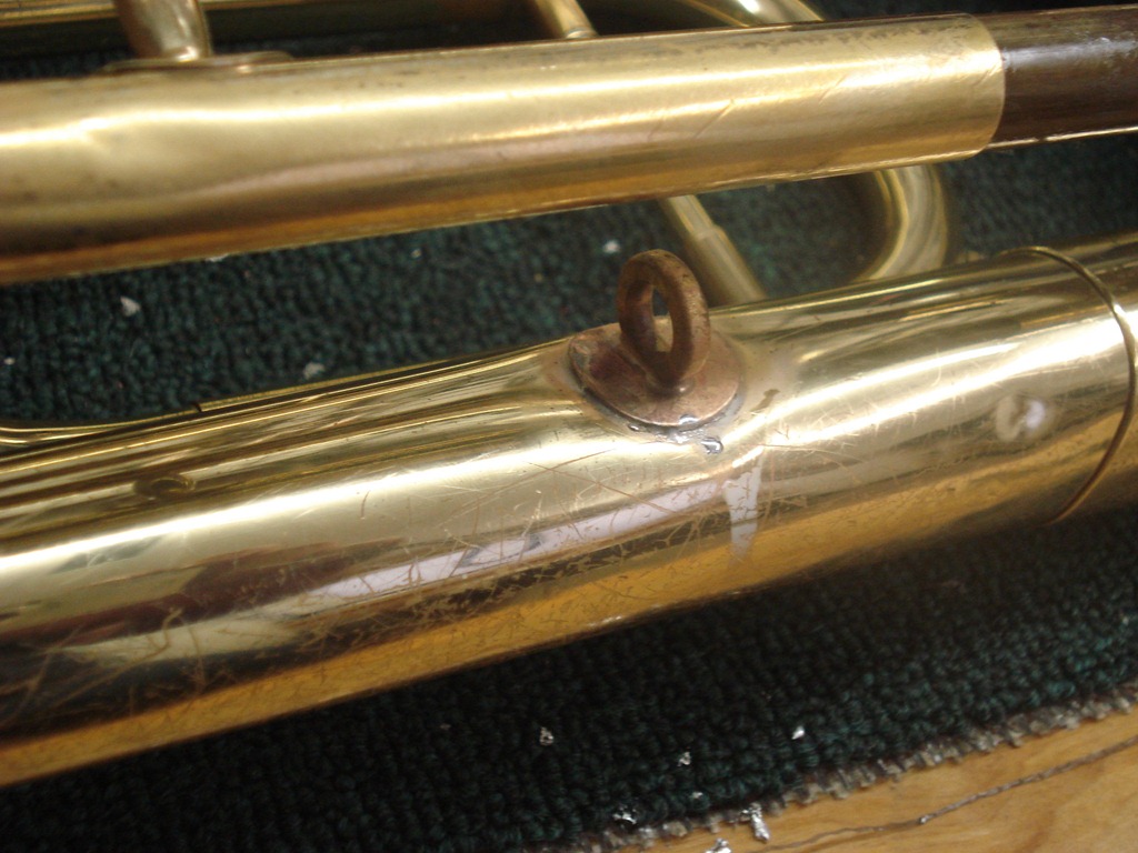 Right Pic – I’ve soldered a sax strap ring into the dented area