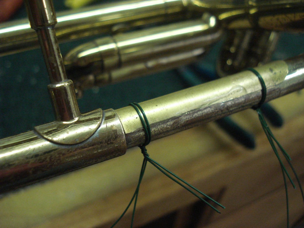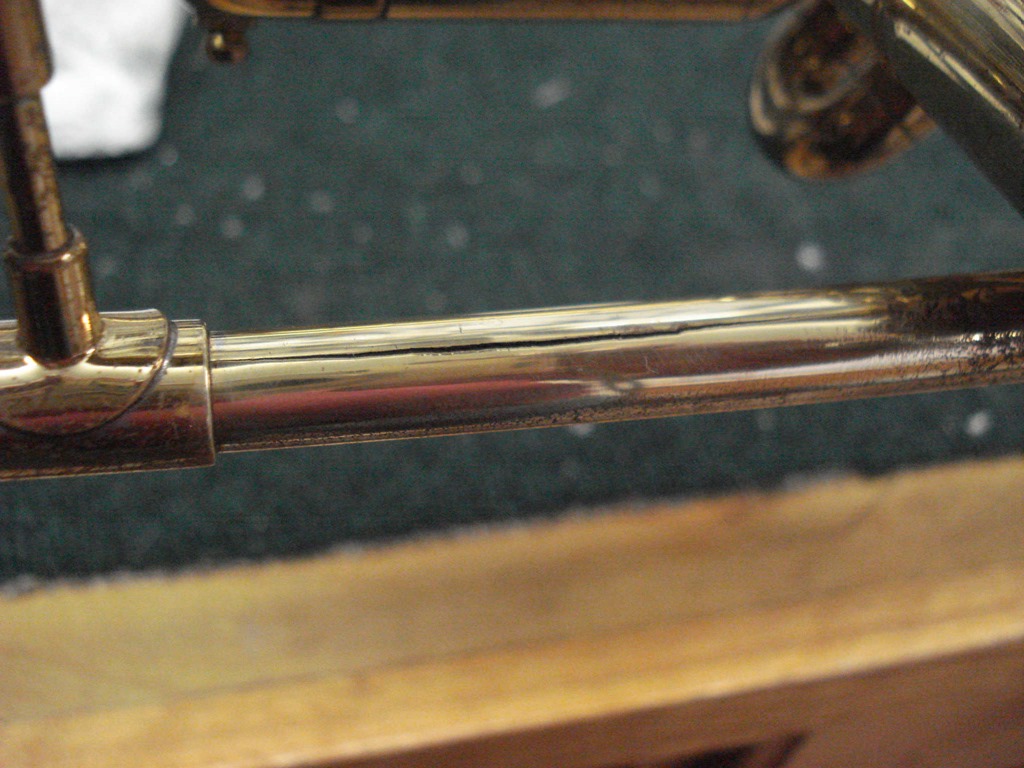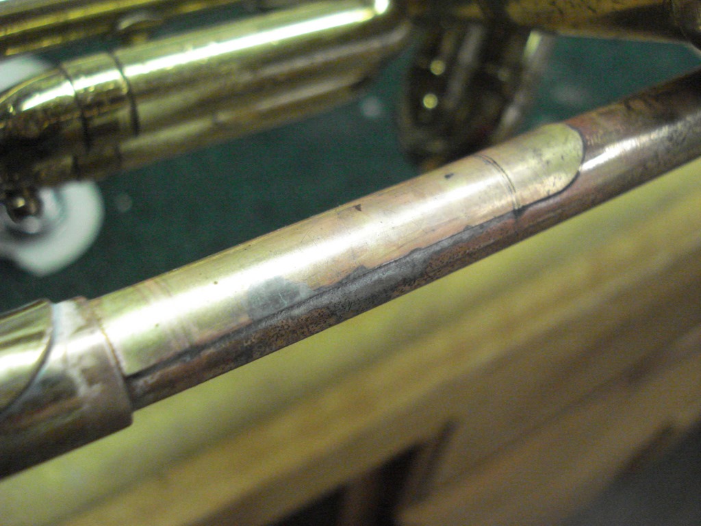 This trumpet befuddled the band director(and her trumpet playing band director husband) as to why it wasn’t playing well, and how they could feel air escaping. It took me a while, but I finally found the split in the leadpipe. In normal light it was very hard to see the split. Here’s how I fixed it: