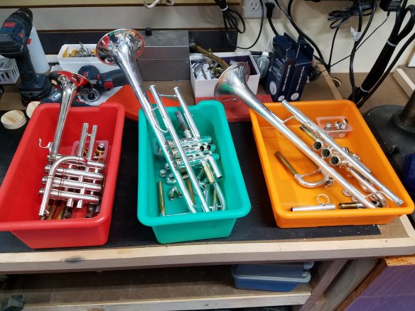 2 Bach Trumpets, a Stomvi Picc, and 3 baritones in for ultrasonic cleaning…already did 3 trumpets and 2 baritones earlier this morning.