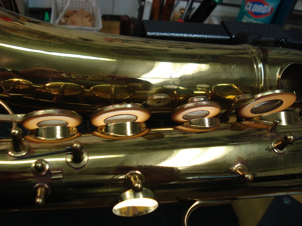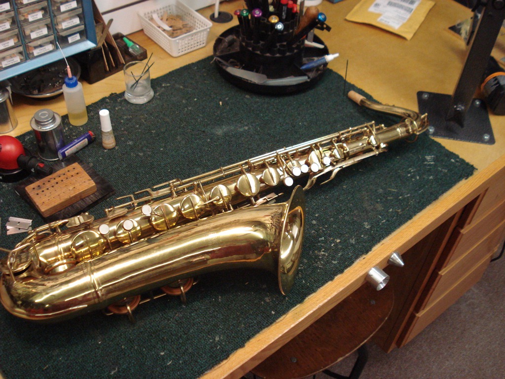 1950’s-ish Pan American (by Conn) Tenor Sax in for a repad. Horn’s been re-lacquered at some point, but in good shape.