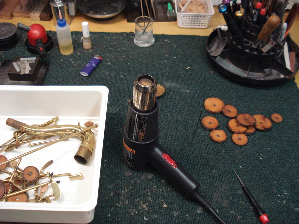 Left Pic – Removing old pads with a hot-air gun…lacquer seemed a bit sketchy, decided not to risk a torch