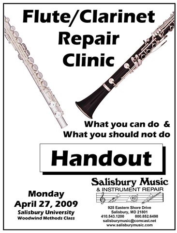 As I told you last week, I was invited to speak to the Instrument Methods Class at Salisbury University last week. I talked with the students about many aspects of repairing flutes and clarinets. At point’s I covered other instruments, but kept the talk mostly to the upper woodwinds. Below is the hand out I gave out. Feel free to download. It is a PDF file.